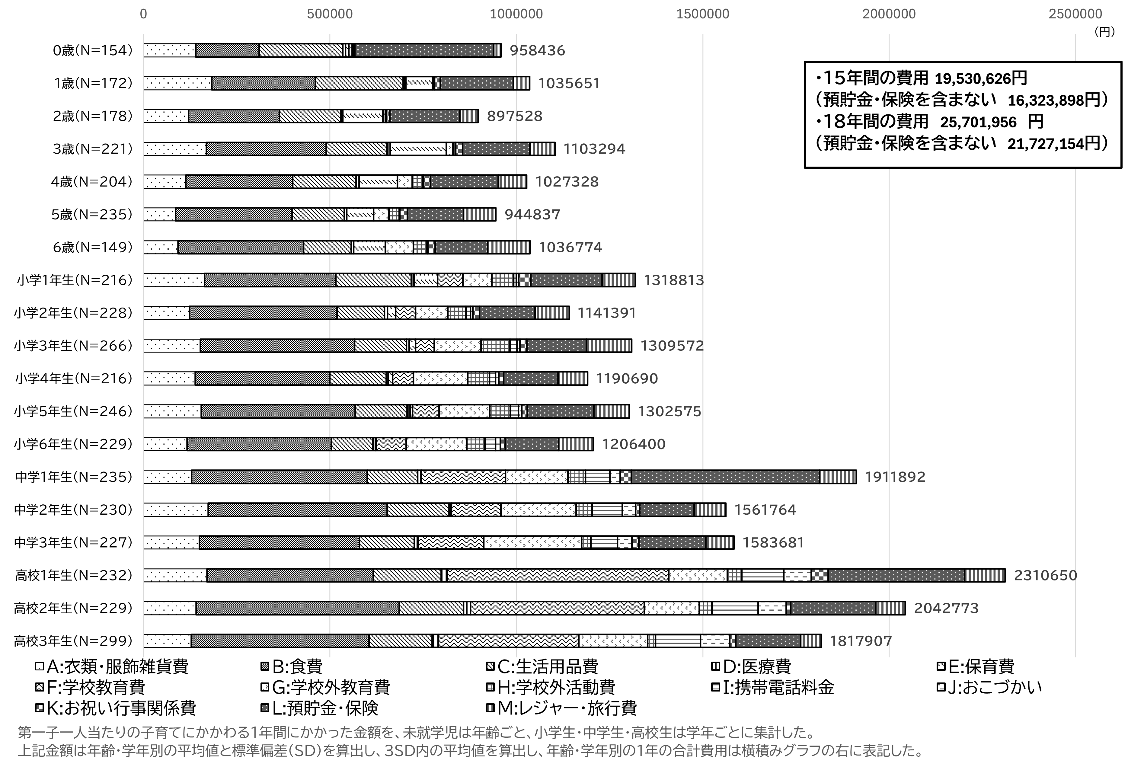 - 第一子の0歳~高校3年生の18年間の子育て費用は預貯金・保険を含むと25,701,956円(預貯金・保険を含まない場合:21,727,154円)でした。全体的に、年間費用は年齢とともに増加していました。このうち、衣類、食費、生活用品などの生活費も年齢とともに一貫して増加しており、常に年間費用の半分程度を占めました。